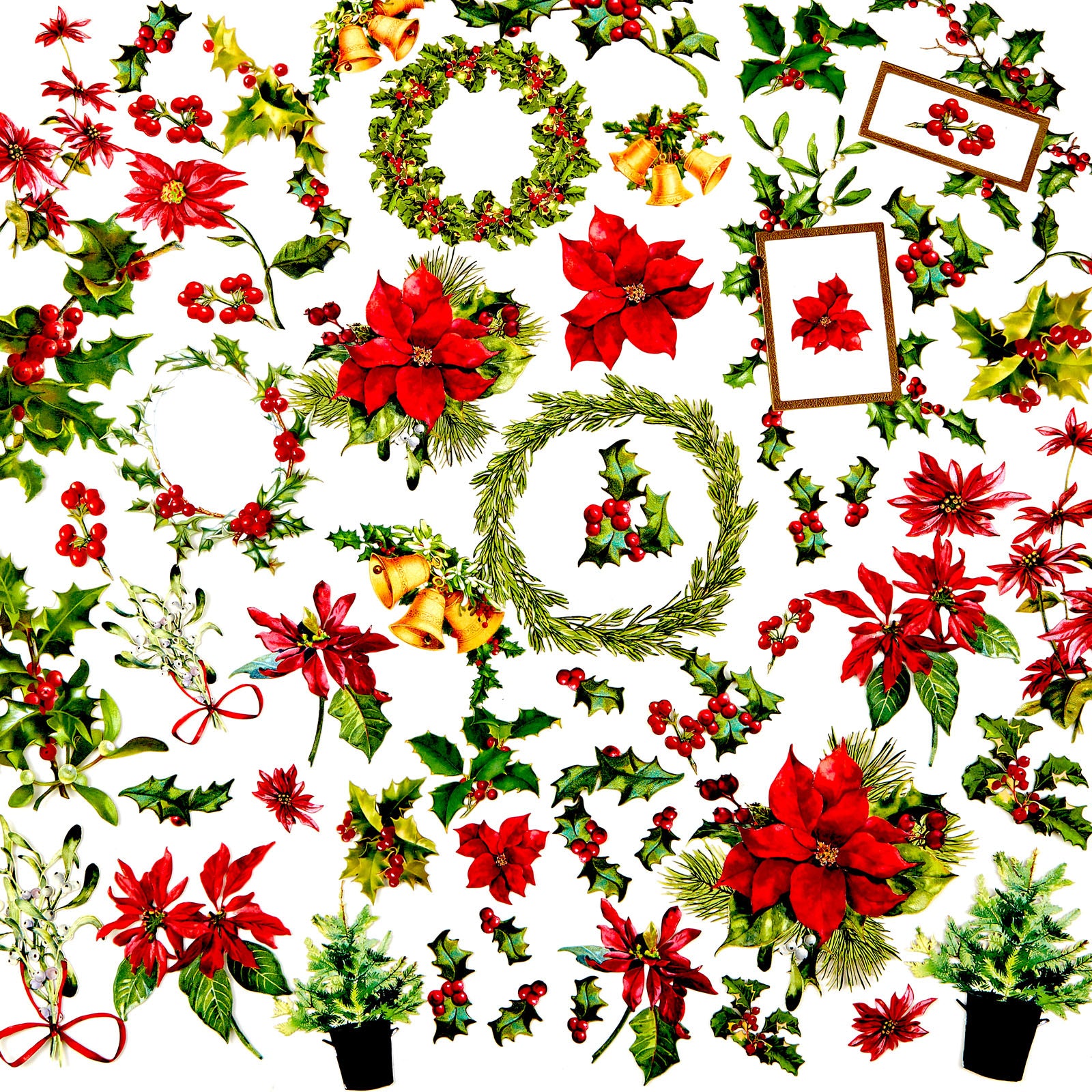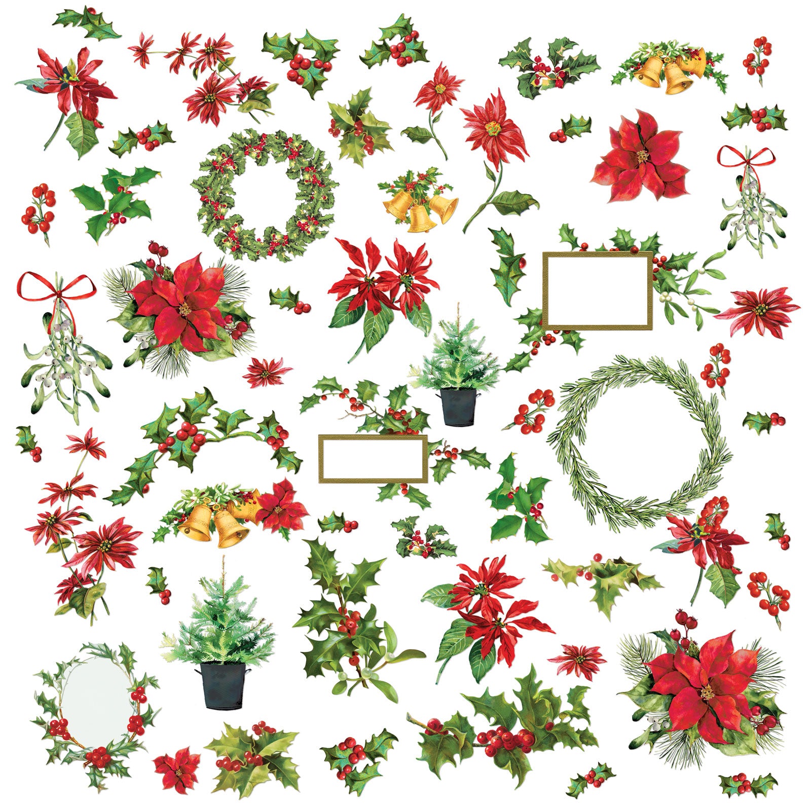 This package of 61 Laser Cut Elements, Greenery, is part of the Christmas Spectacular Collection from 49 and Market. This package includes wreaths, mistletoe, florals, holly, poinsettias, mistletoe, bells, trees, and more. These pieces can be removed from the backing by releasing the tiny tabs that secure them to the sheet. This package contains four sheets of 6" x 12.5" heavyweight cardstock. These pieces are acid free.