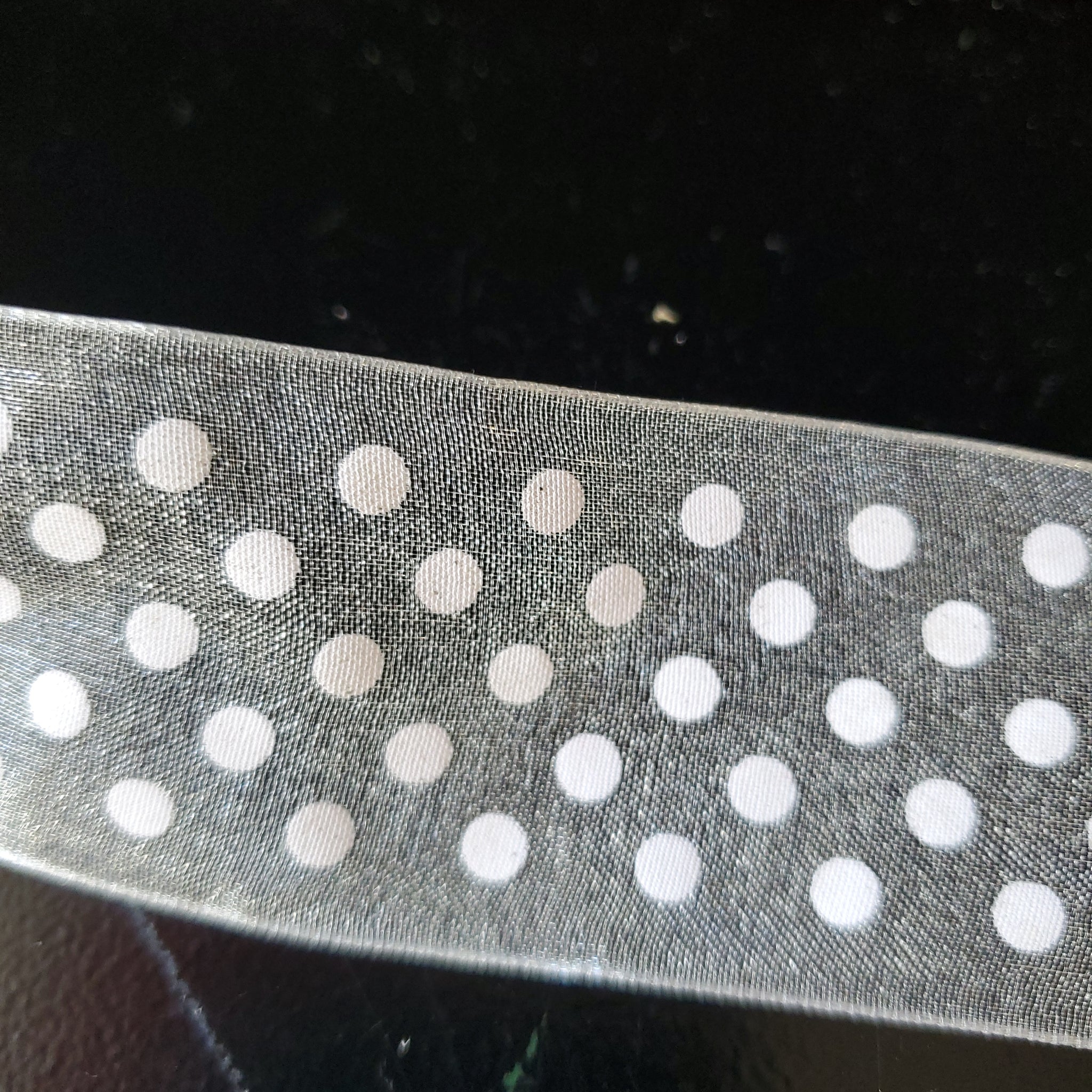 This 1 ½ inch ribbon is sheer with a white dotted pattern.