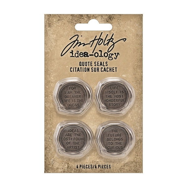 Add a tiny thought to your craft projects with Quote Seals! The Tim Holtz Quote Seals are metal tokens that mimic the look of being stamped into the wax. Each seal features a different quote to adorn your next project. Quote, Seals are decorative metal accents with stamped quotes.