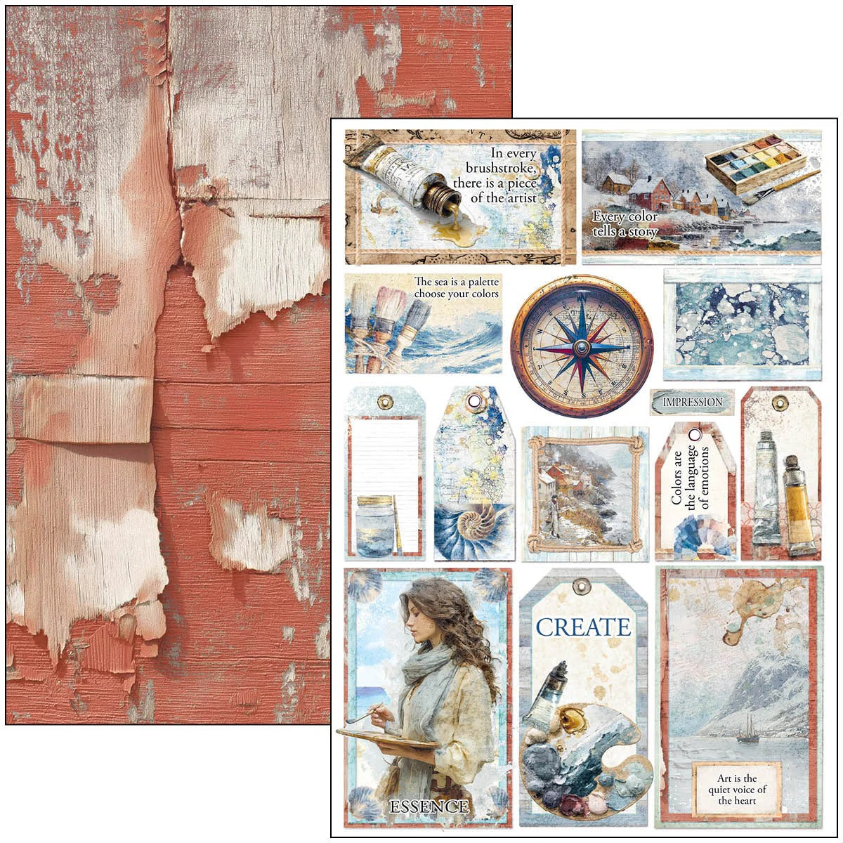 An Artist Journey, Inspiration on Northern Winds. An Artist Journey evokes the solitary path of an artist seeking inspiration along the rugged coasts of Northern Europe. Majestic fjords, shifting skies and quiet villages transform into sketches, colours and memories. The soul of this collection. Its palette reflects the stark beauty of the North: deep ocean blues, the crisp whites and ivories of morning light, and the warm red of Norwegian wooden houses, scattered like safe havens across the landscape. Every element recalls a step of the journey. Fleeting sketches, diary fragments, textures of raw canvas and weathered paper. Whether outdoors among rocks and waves, or in the silence of the atelier, creativity becomes a voyage of introspection and transformation.