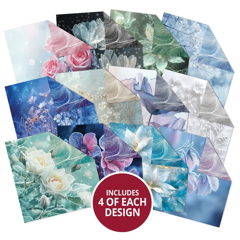 Get crafting with the Frosted Flowers & Winter Breeze Duo Design Paper Pad. Open the pad one way to reveal a beautiful array of frosted florals in cool winter hues. There’s everything from icy white poinsettias, to rosy pink petals and frosted meadows. All have that cool early morning dewy look in icy blues, frosted lavenders, glistening greens and so much more! To suit many occasions and themes throughout the winter months, from well wishes, sympathy, winter birthdays and even Christmas cards and projects.
