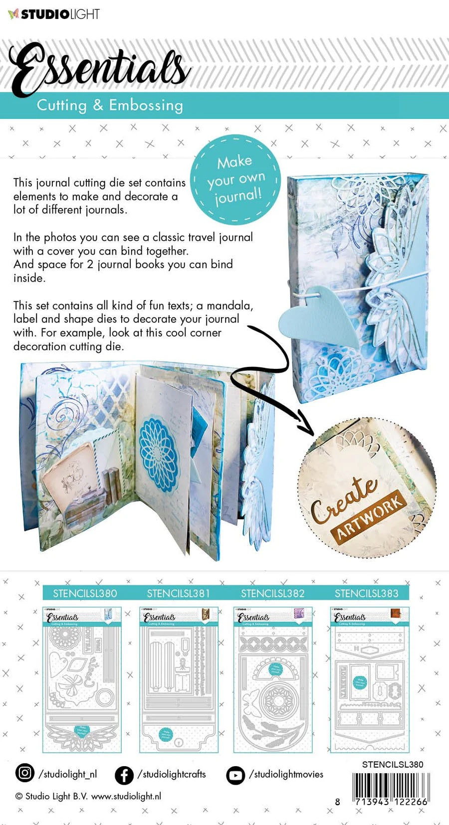 This cutting and embossing die set contains elements to make and decorate different journals. For example a classic travel journal with a cover you can bind together with space for 2 additional journal books you can bind inside. This set contains fun texts, a mandala, and label and shape dies to decorate your journal